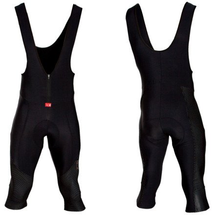 The temperature hovers around 50F, and it's drizzly and windy, but you plan to ride. Pull on the Capoforma Men's Limited Edition Roubaix Bib Knickers, and stay toasty all the way to your knees. Capoforma used Teflon-treated insulating and wind-resistant fabric for weather protection and constructed these knickers using eight panels that wrap your body for a close, muscle-compressing fit. The bib portion is cut higher than on bib shorts for added insulation around your core, and silicone gel gripper won't let these knickers ride up. The multi-density elastic chamois is perforated for air flow and wicks sweat for comfort on long rides, plus it features silver ion threads that work as an antimicrobial.Product Features
